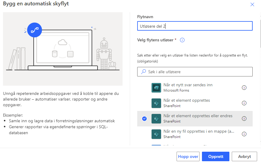 I dette eksempelet skal vi se på SharePoint utløseren som heter “Når et element opprettes eller endres“, som definitivt er en av de utløserne som brukes mest.