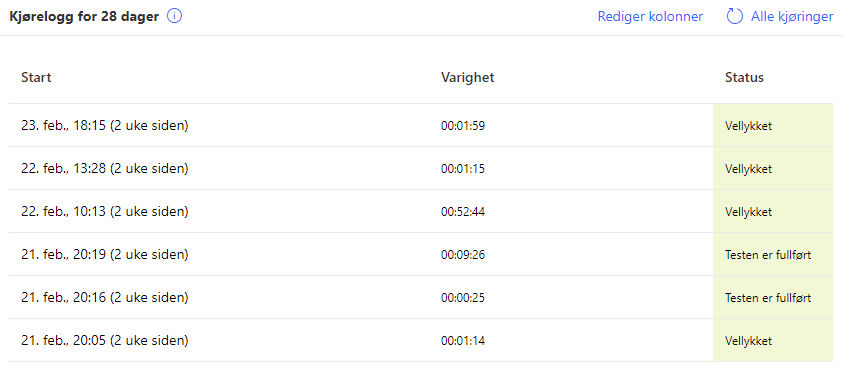 Hver gang arbeidsflyten starter vil Power Automate logge “kjøringen”, her kan vi se om arbeidsflyten kjørte riktig og gjorde det vi tenkte den skal gjøre. Kjøreloggen varer i 28 dager.